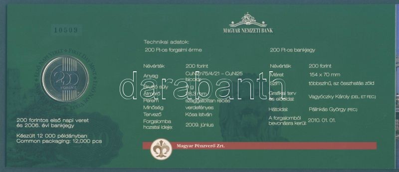 Beschreibung: 2009. 200Ft elsőnapi veret + 200Ft bankjegy "Búcsú a 200Ft-os bankjegytől" díszcsomagolásban T:BU, I Csak 12.000db!