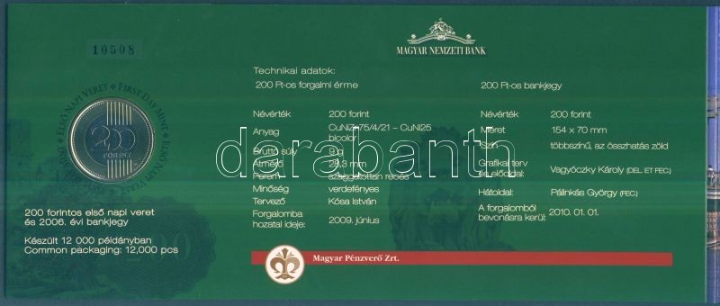 Beschreibung: 2009. 200Ft elsőnapi veret + 200Ft bankjegy "Búcsú a 200Ft-os bankjegytől" díszcsomagolásban T:BU, I Csak 12.000db!