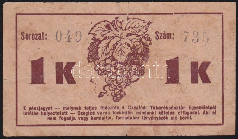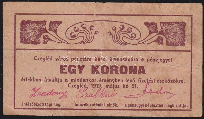 Cegléd 1919. 1K T:III kis beszakadás https://www.darabanth.com/de/139-Fernauktion/139.0/Numismatik/Ungarusche-und-Auslandische-Notgelden~10007/Cegled-1919-1K-TIII-kis-beszakadas~II406063