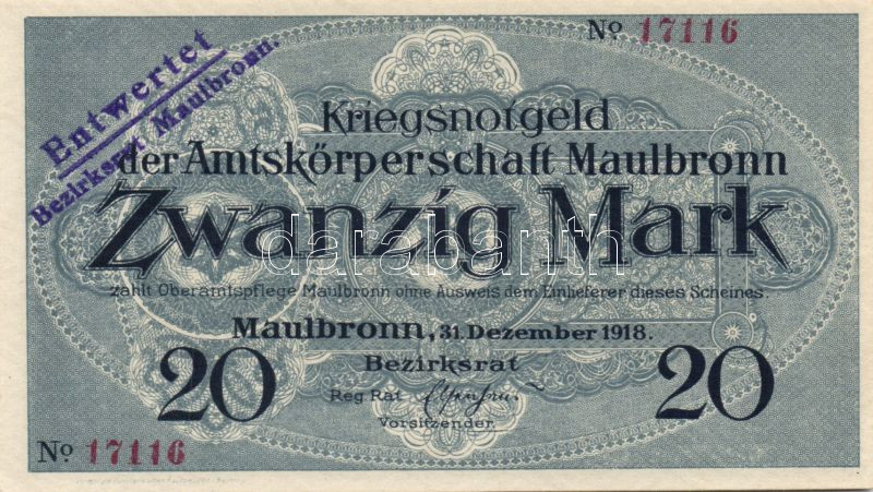 Német Birodalom/Weimari Köztársaság/Maulbronn 1918.12.31. 20M hivatalo... https://www.darabanth.com/de/139-Fernauktion/139.0/Numismatik/Ungarusche-und-Auslandische-Notgelden~10007/Nemet-BirodalomWeimari-KoztarsasagMaulbronn-19181231-20M-hivatalos-ervenytelenitessel-T~II405907