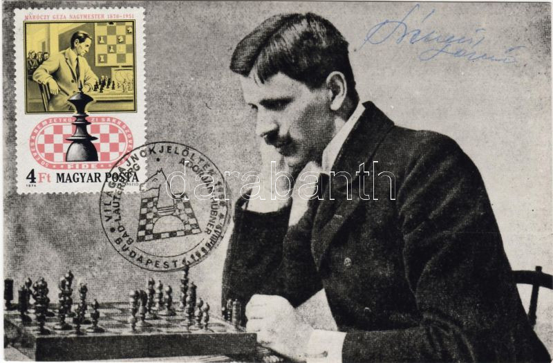 Maróczy Géza az őt ábrázoló bélyeggel, ( bélyegtervező aláírásával ) https://www.darabanth.com/de/14-Fernauktion/14.0/Ansichtskarten/~111/Maroczy-Geza-az-ot-abrazolo-belyeggel--belyegtervezo-alairasaval-~II20503
