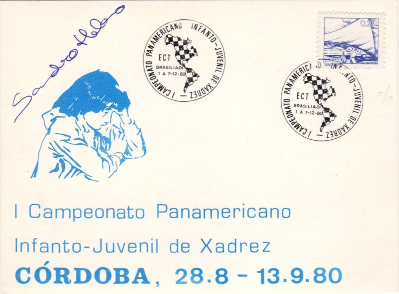 Beschreibung: Brazília: 1980. évi pánamerikai sakkbajnokság lapja győztesének aláírásával két sakkbélyegzéssel