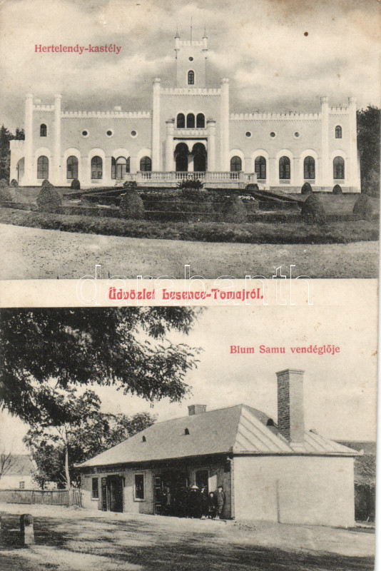 Lesencetomaj Hertelendy-kastély és Blum Samu vendéglője https://www.darabanth.com/de/14-Gross-Auktion/14.1/Ansichtskarten-Ungarn/Ungarn~4343/Lesencetomaj-Hertelendy-kastely-es-Blum-Samu-vendegloje~II539425