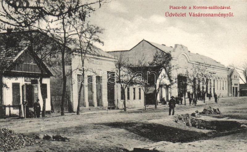 Beschreibung: Vásárosnamény Piactér, Korona Szálloda, Beck Izidor és Mandel Rozália kereskedései