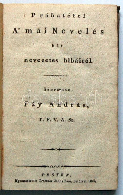Fáy András: Próbatétel. A'mái Nevelés két nevezetes hibáiról. T. P. V.... https://www.darabanth.com/de/14-Gross-Auktion/14.1/Kunst-Dokumente/Bucher-Sonstige-Raritaten~4121/Fay-Andras-Probatetel-Amai-Neveles-ket-nevezetes-hibairol-T-P-V-A-Sz-Pest-1816-T~II536447