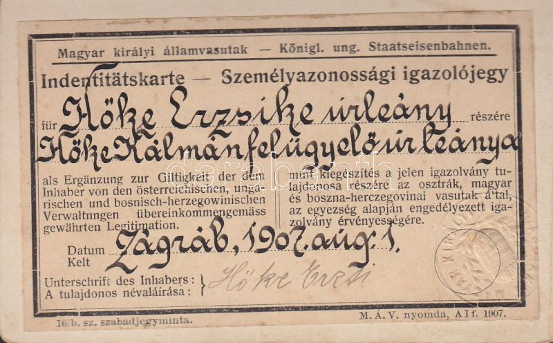 1907. Keményhátú fotó személyazonossági igazolójegy a Magyar királyi á... https://www.darabanth.com/de/140-Fernauktion/140.0/Andere-Sammelgebiete/Dokument~40004/1907-Kemenyhatu-foto-szemelyazonossagi-igazolojegy-a-Magyar-kiralyi-allamvasutak-hasznala~II400960