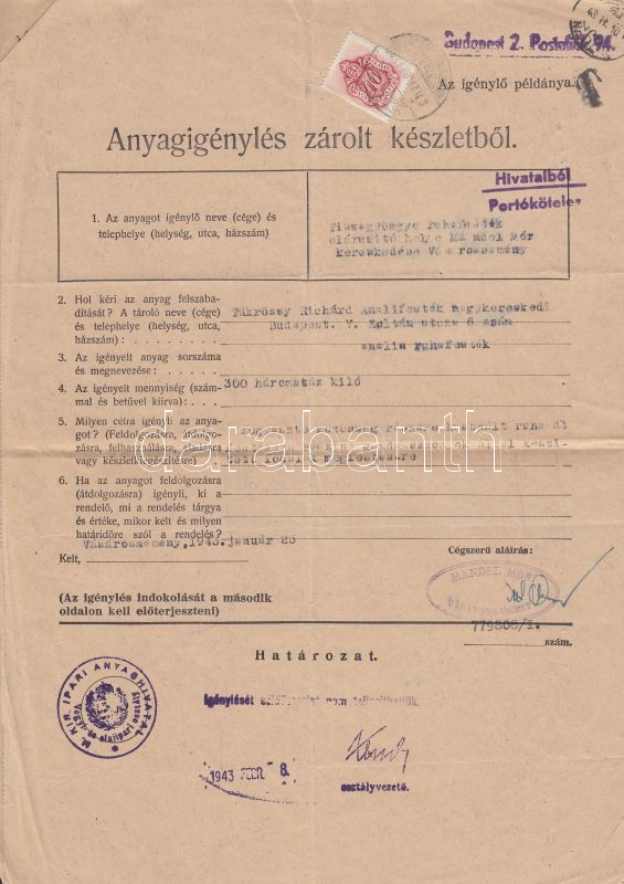 Beschreibung: Anyagigénylési okmány (elutasított) zárolt készletből mindkét példány