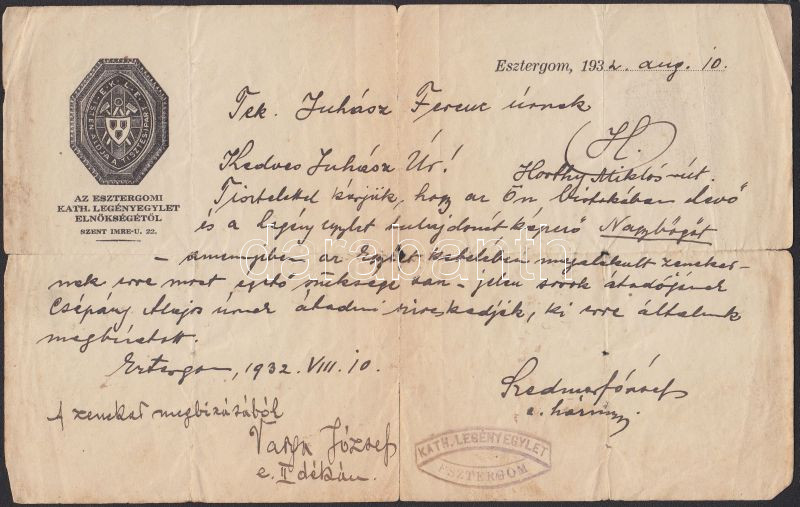 1932 Esztergomi Katholikus Legényegylet papírja https://www.darabanth.com/de/140-Fernauktion/140.0/Andere-Sammelgebiete/Drucksachen~40015/1932-Esztergomi-Katholikus-Legenyegylet-papirja~II413276
