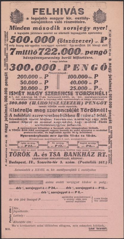 ~1930 Török A. és Társa Bankház Rt. osztálysorsjáték válasz levelezőla... https://www.darabanth.com/de/140-Fernauktion/140.0/Andere-Sammelgebiete/Drucksachen~40015/7E1930-Torok-A-es-Tarsa-Bankhaz-Rt-osztalysorsjatek-valasz-levelezolappal~II413336