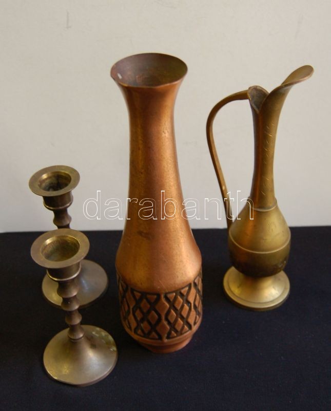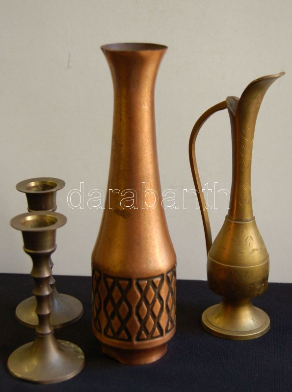 Beschreibung: Kis réz tétel: 2 kis gyertyatartó + 2 vázácska
