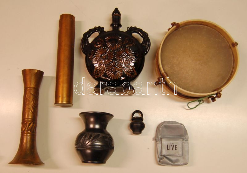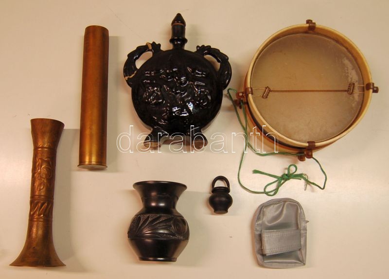 Beschreibung: Vegyes bolha tétel: dob, váza, ágyú töltényhüvely, kerámia váza, kerámia kulacs, stb.