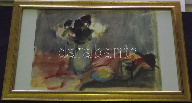 Beschreibung: Halmágyi Sára: Virágos csendélet, akvarell-papír, keretben 29x47 cm