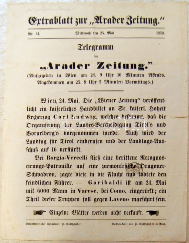 1859.05.25. Német nyelvű távirat szöveg plakát formában az Arader Zeitung-hoz a francia-osztrák csatáról, megemlítve Garibaldit és 6000 katonáját, ritka!!! / Poster of the Arader Zeitung about the Austrian-French battle and Garibaldi