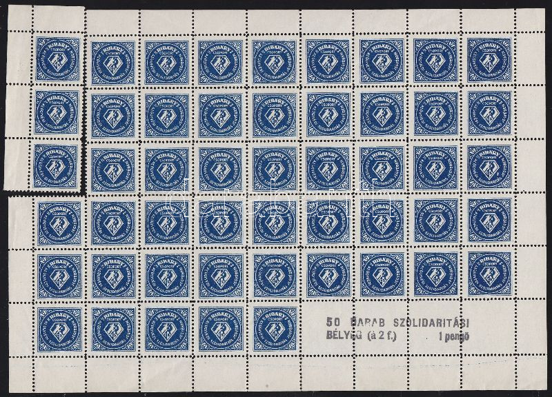 Beschreibung: 1930 Ribáry csoport 50 db ügyvédi szolidaritási bélyeg, 6 x 9-es ívben 4 üres mezővel (3 bélyeg ívsarokkal leválva)