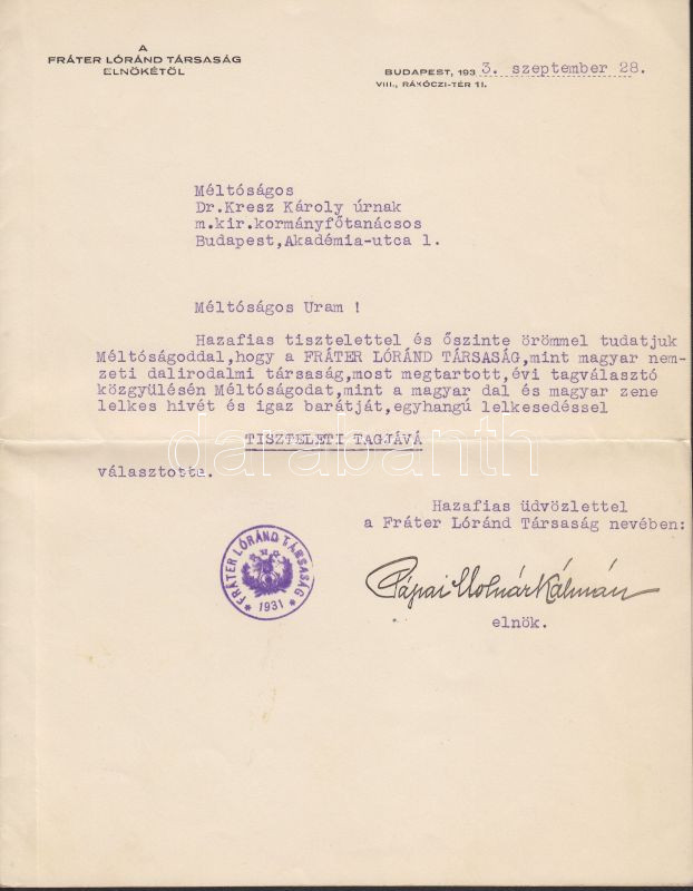 1933. Pápai Molnár Kálmán zeneszerző aláírt levele https://www.darabanth.com/de/140-Fernauktion/140.0/Andere-Sammelgebiete/Signatur~40006/1933-Papai-Molnar-Kalman-zeneszerzo-alairt-levele~II401212