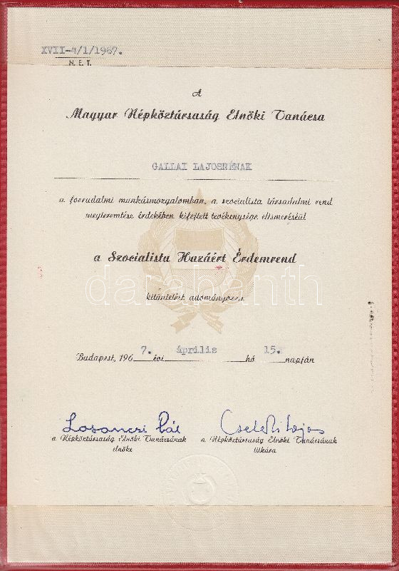 1967. A Szocialista Hazáért Érdemrend kitüntetés adományozó okirata L... https://www.darabanth.com/de/140-Fernauktion/140.0/Andere-Sammelgebiete/Signatur~40006/1967-A-Szocialista-Hazaert-Erdemrend-kituntetes-adomanyozo-okirata-Losonczi-Pal-az-Elnok~II412920