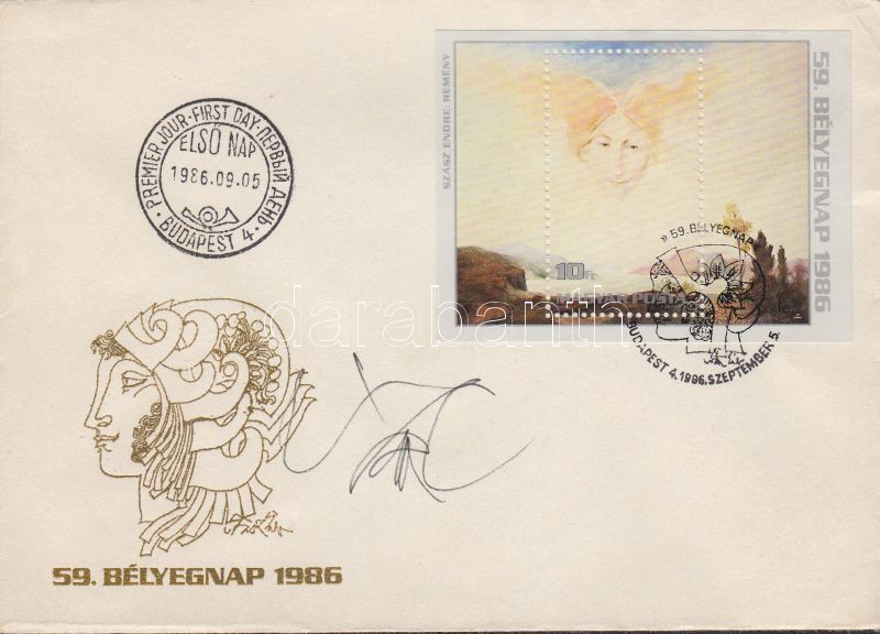 1986 Bélyegnap FDC, rajta a tervező Szász Endre saját kezű aláírásával https://www.darabanth.com/de/140-Fernauktion/140.0/Andere-Sammelgebiete/Signatur~40006/1986-Belyegnap-FDC-rajta-a-tervezo-Szasz-Endre-sajat-kezu-alairasaval~II401315