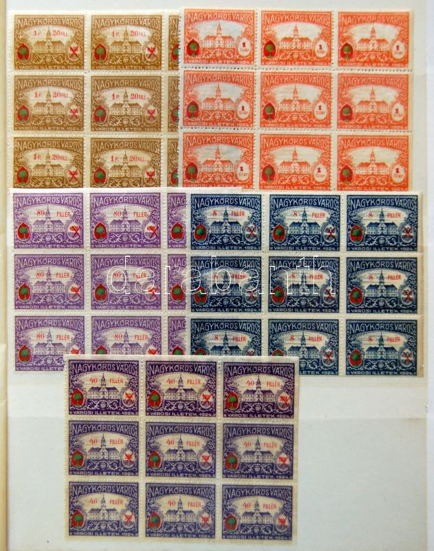 Beschreibung: Nagykőrös Város felülnyomott illetékbélyeg sor 5 értéke kilencestömbökben