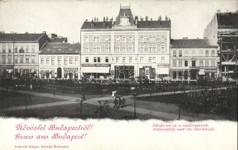 Beschreibung: Budapest IV. István tér Vásárcsarnok; Laufer József Bor- és Sörházával, Fuchs Ede, Hoffmann Albert és Bloch Salamon üzleteivel