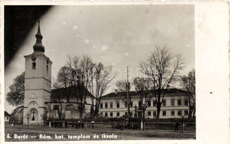 Barót Catholic church, school and national flag https://www.darabanth.com/de/141-Fernauktion/141.0/Ansichtskarten/Siebenburgen~140/Barot-Catholic-church-school-and-national-flag~II418400
