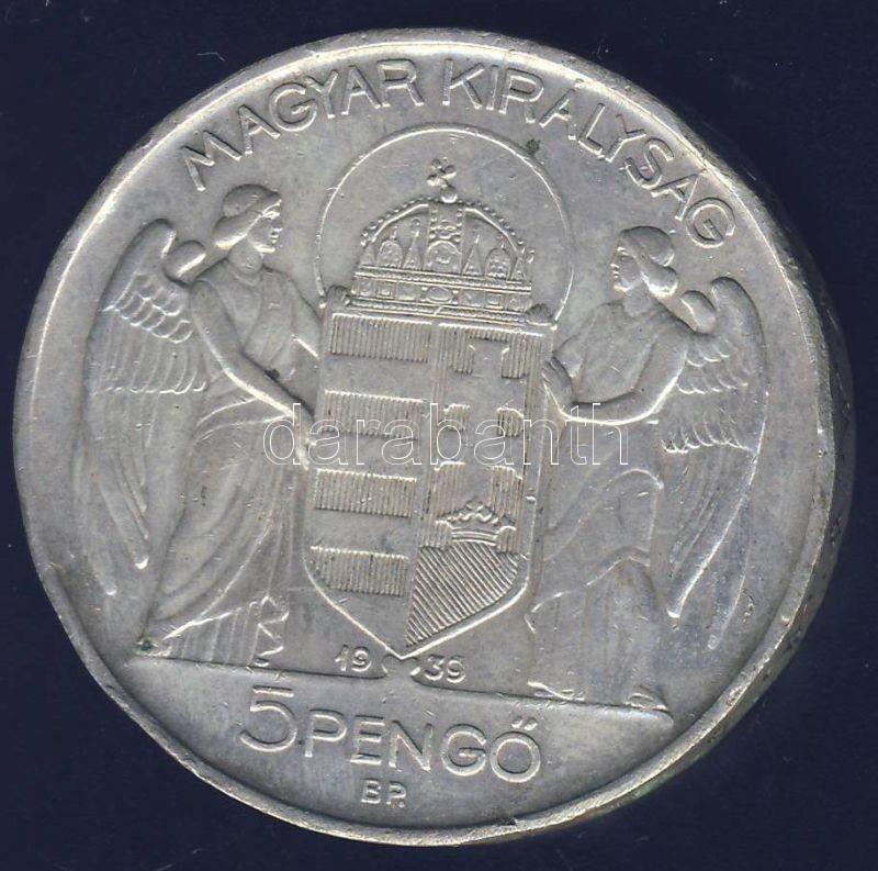 1939. 5P Ag "Horthy - balra" T:3 https://www.darabanth.com/de/141-Fernauktion/141.0/Numismatik/Ungarische-Munzen~10009/1939-5P-Ag-Horthy--balra-T3~II418290