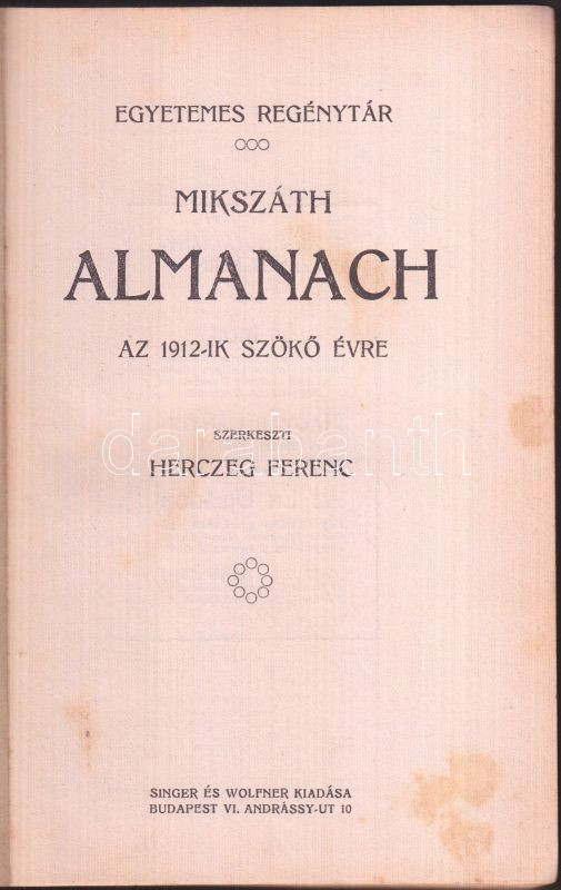 Almanach az 1912-es évre, Herczeg ferenc szerkesztésével, Singer és Wo... https://www.darabanth.com/de/142-Fernauktion/142.0/Andere-Sammelgebiete/Bucher-Sonstige-Raritaten~172/Almanach-az-1912-es-evre-Herczeg-ferenc-szerkesztesevel-Singer-es-Wolfner-kiadas-aranyozott-~II422487