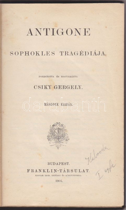 Antigone Sophokles tragádiája, ford: Csiky Gergely, Franklin, Bp. 1904... https://www.darabanth.com/de/142-Fernauktion/142.0/Andere-Sammelgebiete/Bucher-Sonstige-Raritaten~172/Antigone-Sophokles-tragadiaja-ford-Csiky-Gergely-Franklin-Bp-1904-hozzakotve-Sophokles-El~II391049