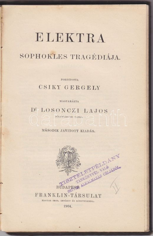 Beschreibung: Antigone Sophokles tragádiája, ford: Csiky Gergely, Franklin, Bp. 1904 hozzákötve, Sophokles: Elektra Losonczi Lajos magyrázatával, Franklin 1904, korabeli egészvászon kötésben