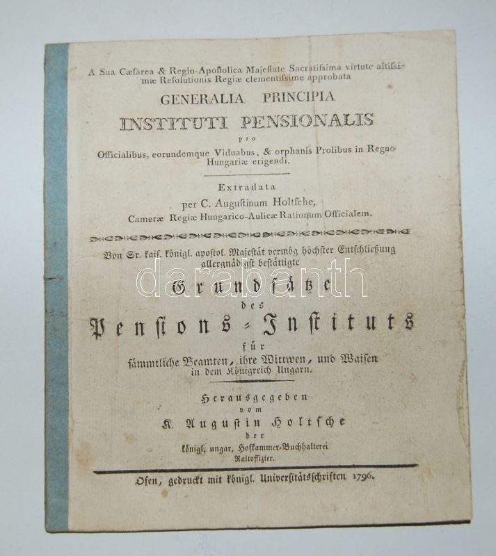 Holtsche: ...Generalia principia instituti pensionalis pro officialibus, eorundemque viduabus, & orphanis prolibus in regno Hungariae erigendi. - Grunsätze des Pensions-Instituts für sämmtl. Beamte, ihre Wittwen, u. Warsen, in dem Königr. Ungarn. Buda, 1796. Egyetemi nyomda 39p.