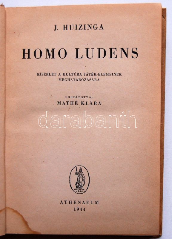 Johann Huizinga: Homo Ludens. Kísérlet a kultúra játékelemeinek meghat... https://www.darabanth.com/de/142-Fernauktion/142.0/Andere-Sammelgebiete/Bucher-Sonstige-Raritaten~172/Johann-Huizinga-Homo-Ludens-Kiserlet-a-kultura-jatekelemeinek-meghatarozasara-Ford-Math~II403763