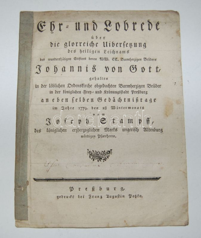 Joseph Stampff (Stampf József pozsonyi plébános): Ehr- und Lobrede üb... https://www.darabanth.com/de/142-Fernauktion/142.0/Andere-Sammelgebiete/Bucher-Sonstige-Raritaten~172/Joseph-Stampff-Stampf-Jozsef-pozsonyi-plebanos-Ehr-und-Lobrede-uber-die-glorreiche-Uiberset~II420908