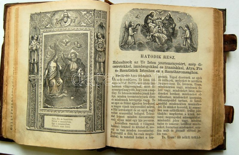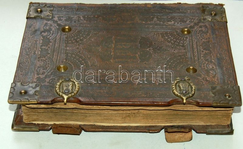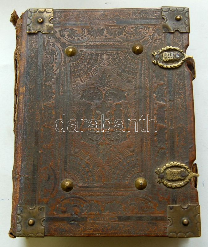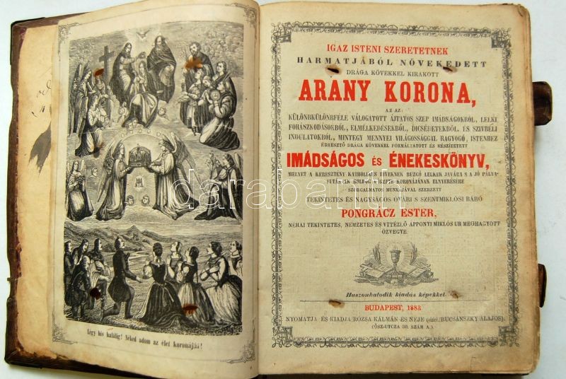 Pongrácz Eszter: Arany Korona képes imádságos könyv. Dombornyomott fatáblás egészbőr kötésben sárgaréz vasalásokkal, magyar címert ábrázoló réz kapcsokkal. (az egyik fatábla kettétört) 1883, 420p