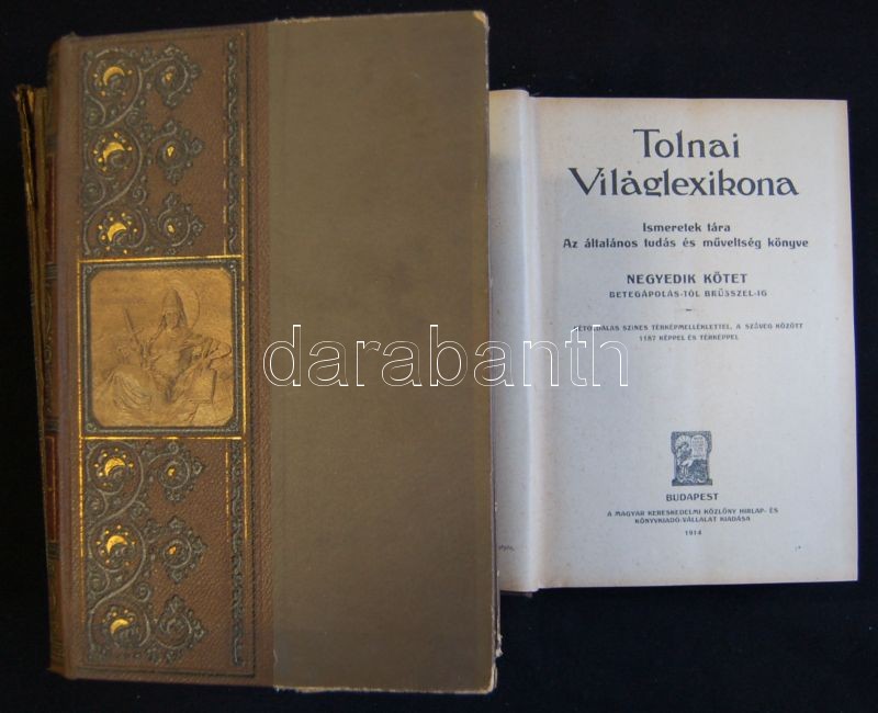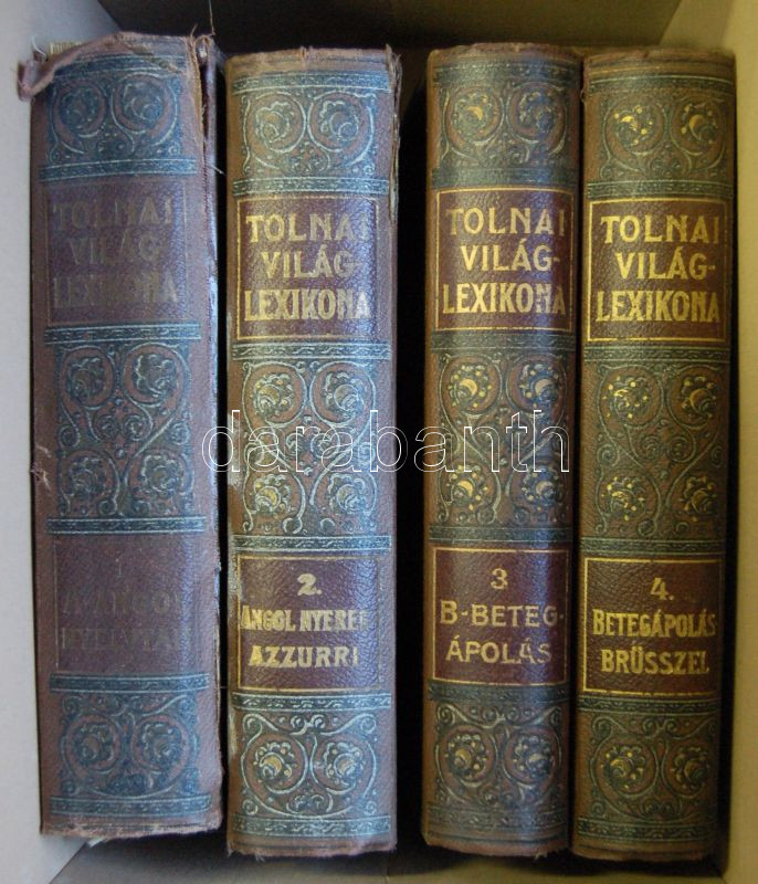 Tolnai Világlexikona 1,2,3,4. kötetek Magyar Ker. Közlöny Hírlap és könyvkiadó Vállalat kiadása, Budapest, 1912-1913 díszes aranyozott kiadói félbőr kötésben, fém dombor betéttel (Az első kötet gerince sérült a többi szép állapotban)