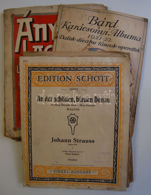 Beschreibung: 24 db klf magyar és külföldi kotta: Menuet, Lemondás, Aranymadár, Két fekete holló, Marica grófnő, A csipkekendő, stb. Kissé viseltes állapotban