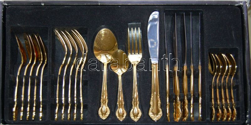 Beschreibung: 6 személyes 24 darabos teljesen új állapotú aranyozott étkészlet eredeti dobozban / Gold plated set of cutleries