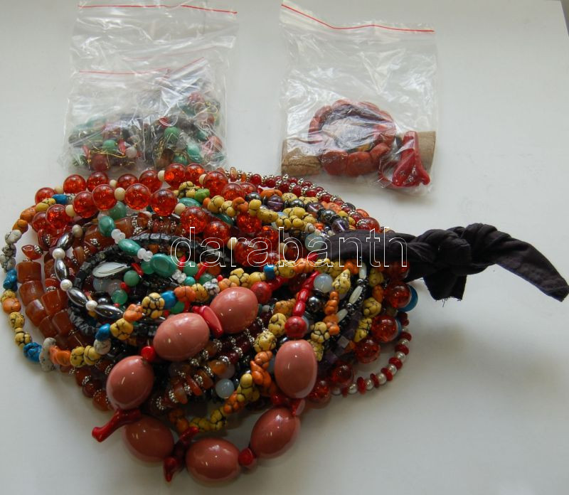 Nagy bizsu tétel: 30 db féldrágakő nyaklánc és 60 pár fülbevaló - korall, unakit, mokait, hematit, achátok, howlitok, ametiszt, tenyésztett gyöngy, obszidián, jáspisok, citrin, rózsakvarc, stb.