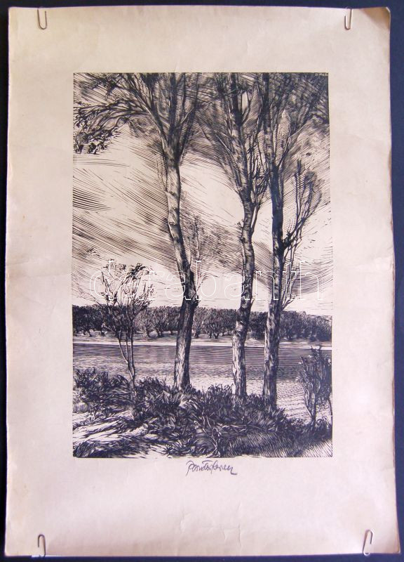 Beschreibung: Bordás Ferenc (1911-1982): Tiszapart, linómetszet-papír, jelzett, 35x50 cm