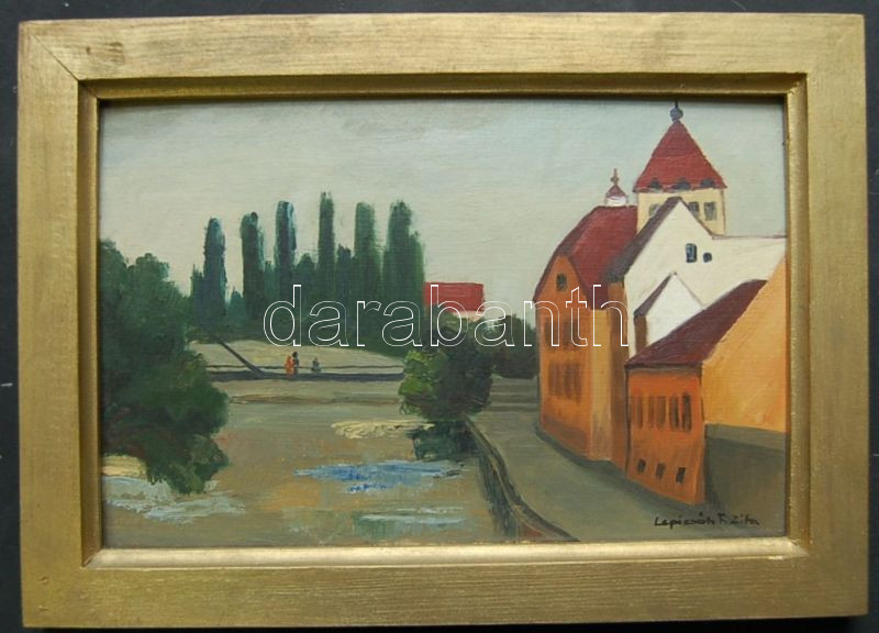 Beschreibung: Lepizsán Fékics Zita (1936): Erdélyi városrészlet, olaj-farost, jelzett, keretben 36x26