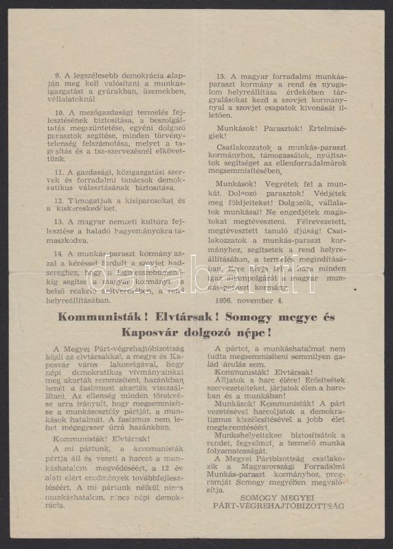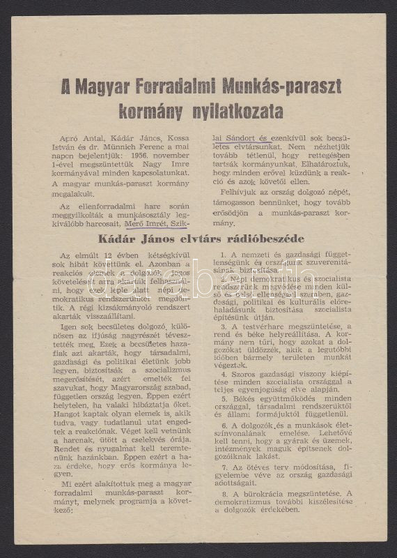 1956 A Forradalmi Munkás-Paraszt Kormány röplapja melyben bejelenti me... https://www.darabanth.com/de/142-Fernauktion/142.0/Andere-Sammelgebiete/Historische-Dokumenten-Handschriften~154/1956-A-Forradalmi-Munkas-Paraszt-Kormany-roplapja-melyben-bejelenti-megalakulasat-es-programjC3~II405070