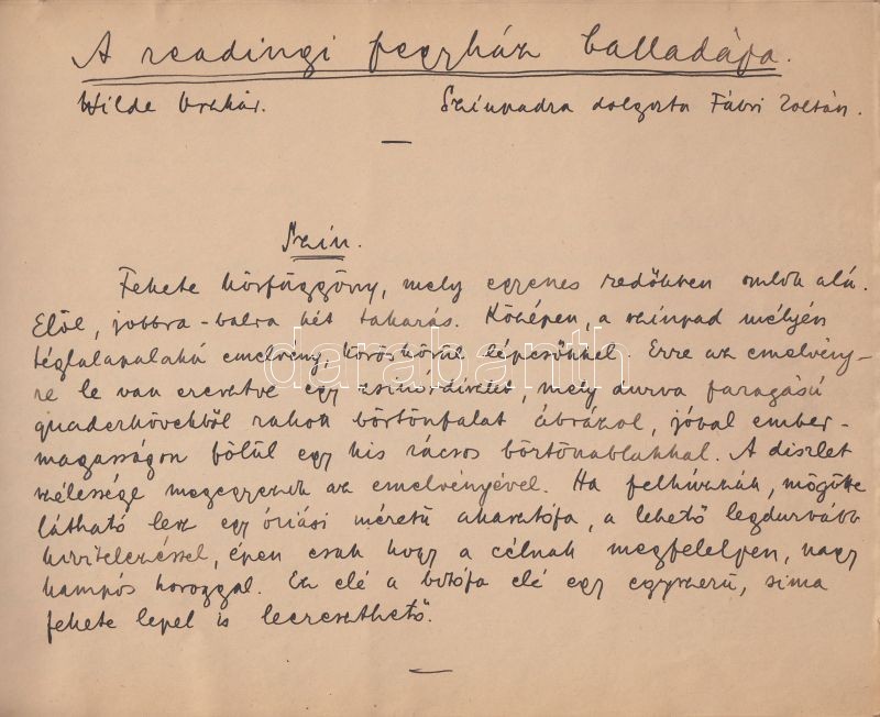 cca 1942 Fábri Zoltán: Wilde: A Readingi fegyház balladája c. Nemzeti SzÃnházban bemutatott művének Fábri által kézzel Ãrt és rajzolt szÃnpadi forgatókönyve néhány dÃszlettervvel füzet formában. 37p. Egyedi példány!