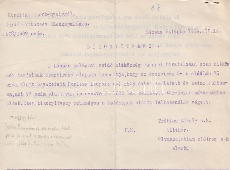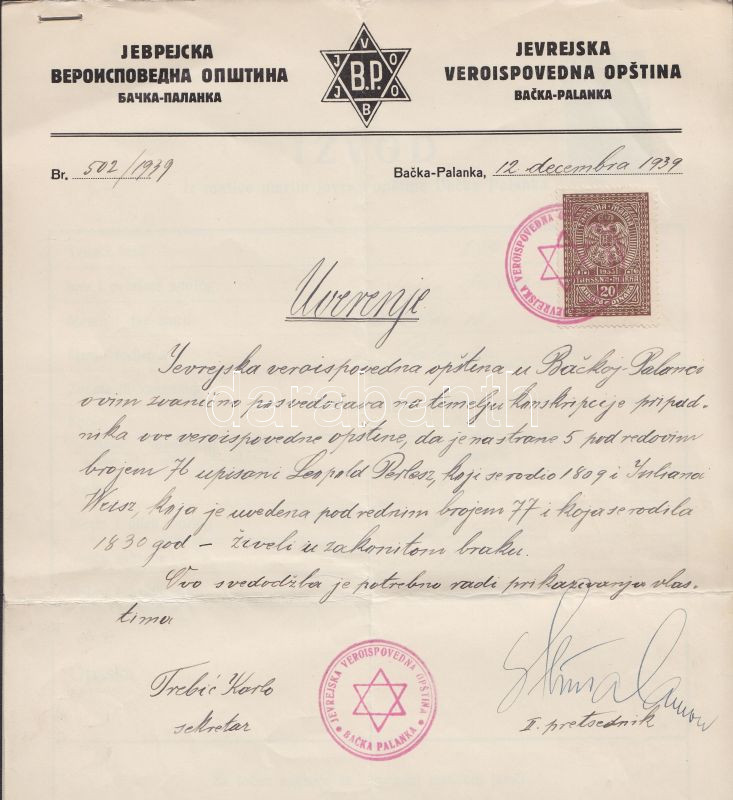 1939 Kivonat a bácska-palánkai zsidó hitközség anyakönyveiből és hivatalos magyar fordítással / extract from the Backa-Palanka Jewish community`s register with official Hungarian trenslatiom