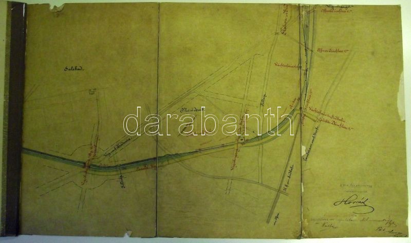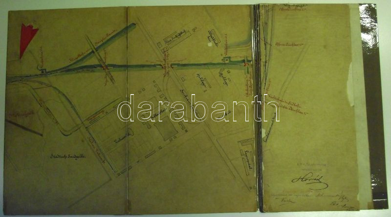 1878 A Magyar Államvasutak vágánytérképe Kelenföldtől Budapest Ferencvárosi pályaudvarig. Kézzel rajzolt nagyméretű térkép rajta a környékbeli intézményekkel, épületekkel (hajtásoknál ragasztott) / Hand painted plan of the surronding rails in Budapest suburb 200x35 cm