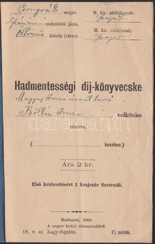 1880 Hadmentességi díj-könyvecske https://www.darabanth.com/de/142-Fernauktion/142.0/Andere-Sammelgebiete/Militaria~164/1880-Hadmentessegi-dij-konyvecske~II405061
