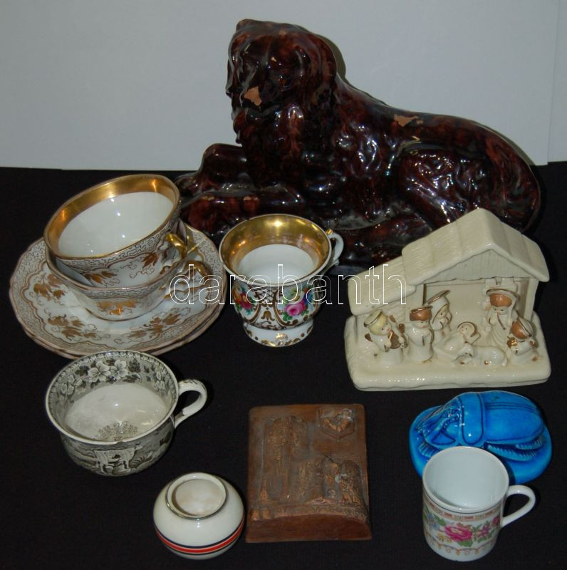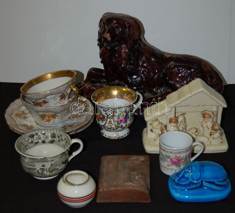 Beschreibung: Nagy vegyes porcelán tétel: betlehem, szkarabeusz bogár, kutya figura, 5 db kávés csésze, 2 kistányér, stb.