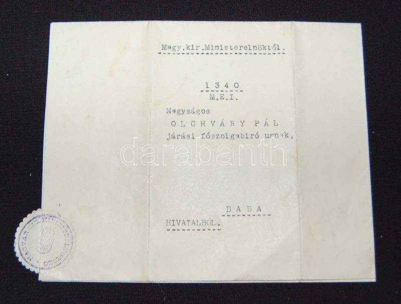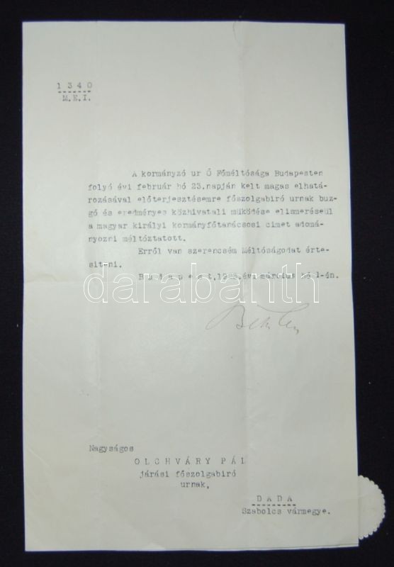 Beschreibung: 1923 Bethlen István miniszterelnök sajátkezű aláírása kinevezésen