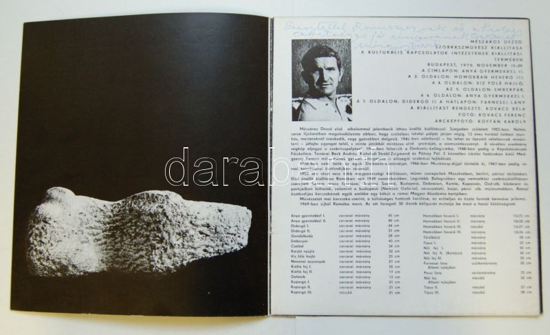 1970 MÉszáros Dezső szobrász dedikált kiállítási katalógusa https://www.darabanth.com/de/142-Fernauktion/142.0/Andere-Sammelgebiete/Signatur~155/1970-MEszaros-Dezso-szobrasz-dedikalt-kiallitasi-katalogusa~II420643