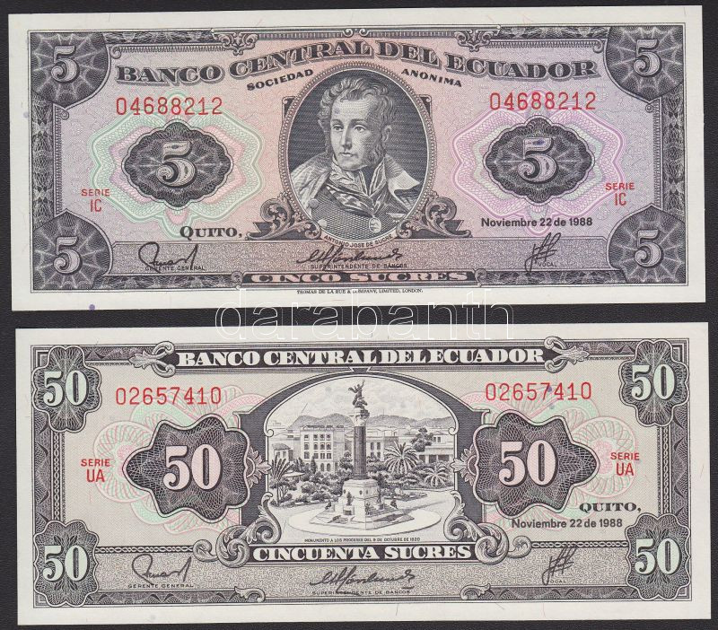 Ecuador 1988. 5S + 50S T:I https://www.darabanth.com/de/142-Fernauktion/142.0/Numismatik/Auslandische-Banknoten~1500012/Ecuador-1988-5S-plus-50S-TI~II411604
