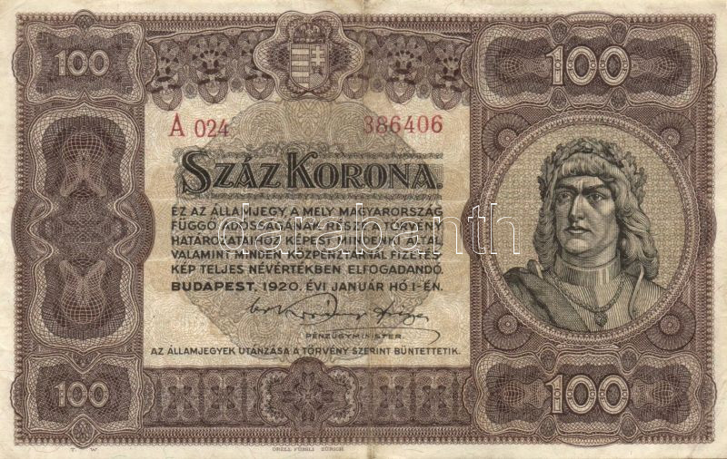 1920. 100K "Orell Füssli Zürich" T:III+ https://www.darabanth.com/de/142-Fernauktion/142.0/Numismatik/Ungarische-banknoten~1500008/1920-100K-Orell-Fussli-Zurich-TIIIplus~II403063