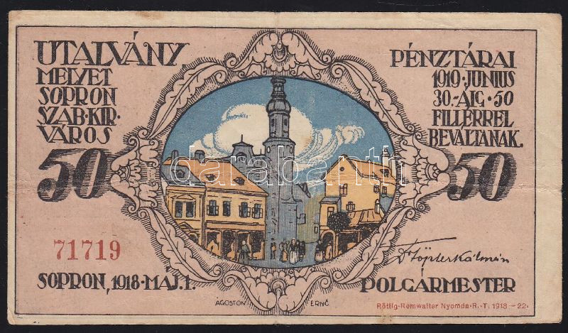 Sopron 1918. 50f utalvány T:III https://www.darabanth.com/de/142-Fernauktion/142.0/Numismatik/Ungarusche-und-Auslandische-Notgelden~1500007/Sopron-1918-50f-utalvany-TIII~II411470
