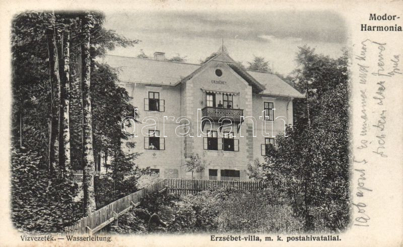 Modor-Harmónia Villa Erzsébet with post office and aqueduct https://www.darabanth.com/de/143-Fernauktion/143.0/Ansichtskarten/Slowakei~900007/Modor-Harmonia-Villa-Erzsebet-with-post-office-and-aqueduct~II426173